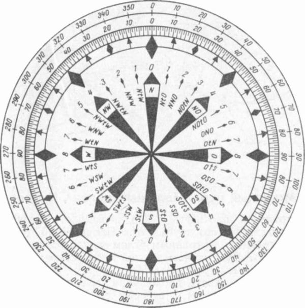 В эпоху парусного флота каждая часть горизонта разбивалась на восемь основных направлений — румбов (рис. 8). Эта система называлась румбовой.