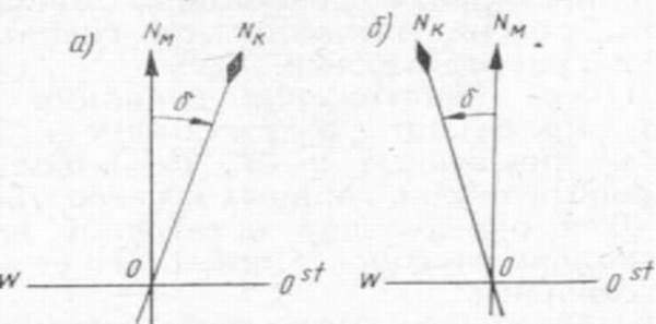 Угол в плоскости истинного горизонта наблюдателя между магнитным и компасным меридианами называют девиацией магнитного компаса (б). Этот угол отсчитывают от нордовой части магнитного меридиана к Ost или W от 0 до 180°. Девиацию называют остовой (восточной), если северная часть компасного меридиана отклоняется от северной части магнитного меридиана к востоку, западной (вестовой), если северная часть компасного меридиана отклоняется от северной части магнитного меридиана к западу. Остовой девиации приписывают знак «плюс», а вестовой — знак «минус» (рис. 20). Величина и знак девиации зависят от влияния, которое оказывает на магнитную стрелку компаса магнитное поле судна совместно с земным магнитным полем.