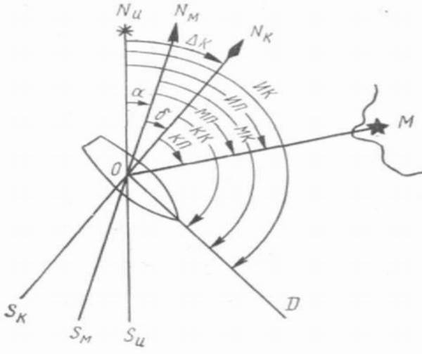 Изобразим на плоскости истинного горизонта три меридиана (рис.21): истинный NиSи, магнитный MMSM и компасный NKSK, направление диаметральной плоскости OD и направление с судна на береговой ориентир ОМ. На чертеже угол NиOD — истинный курс судна, а угол NиOM — истинный пеленг. По аналогии считают, что угол NMOD — магнитный курс (МК), угол NKOD — компасный курс (КК), угол NMOD — магнитный пеленг (МП), а угол NKOM — компасный пеленг (КП).