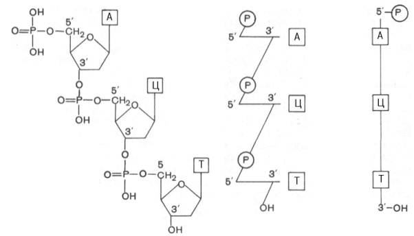 Под первичной структурой нуклеиновых кислот понимают порядок, последовательность расположения мононуклеотидов в полинуклеотидной цепи ДНК и РНК. Такая цепь стабилизируется 3',5'-фосфодиэфирными связями. Поскольку молекулярная масса нуклеиновых кислот колеблется в широких пределах (от 2•104 до 1010–1011), установить первичную структуру всех известных РНК и особенно ДНК весьма сложно. Тем не менее, во всех нуклеиновых кислотах (точнее, в одноцепочечной нуклеиновой кислоте) имеется один и тот же тип связи – 3',5'-фосфодиэфирная связь между соседними нуклеотидами. Эту общую основу структуры можно представить следующим образом: