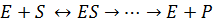 Л. Михаэлис не только постулировал образование промежуточного фермент-субстратного ES-комплекса, но и рассчитал влияние концентрации субстрата на скорость реакции. В процессе реакции различают несколько стадий: присоединение молекулы субстрата к ферменту, преобразование первичного промежуточного соединения в один или несколько последовательных (переходных) комплексов и протекающее в одну или несколько стадий отделение конечных продуктов реакции от фермента. Это можно схематически проиллюстрировать следующими примерами: