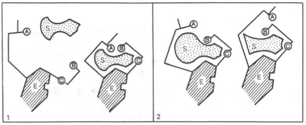 А, В, С - функциональные группы активного центра; 1 - активный комплекс; 2 - неактивный комплекс