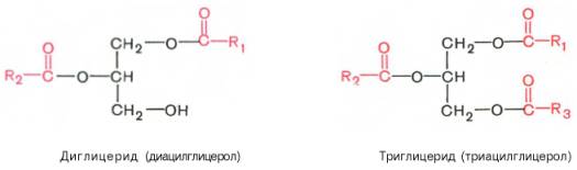 Глицериды(ацилглицерины, или ацилглицеролы) представляют собой сложные эфиры трехатомного спирта глицерина и высших жирных кислот. Если жирными кислотами этерифицированы все три гидроксильные группы глицерина (ацильные радикалы R1, R2и R3могут быть одинаковы или различны), то такое соединение называют триглицеридом (триацилглице-рол), если две – диглицеридом (диацилглицерол) и, наконец, если этери-фицирована одна группа – моноглицеридом (моноацилглицерол):