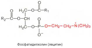 Фосфатидилхолины (лецитины).В отличие от триглицеридов в молекуле фосфатидилхолина одна из трех гидроксильных групп глицерина связана не с жирной, а с фосфорной кислотой. Кроме того, фосфорная кислота в свою очередь соединена эфирной связью с азотистым основанием – холином [НО—СН2—СН2—N+(CH3)3]. Таким образом, в молекуле фосфатидилхолина соединены глицерин, высшие жирные кислоты, фосфорная кислота и холин: