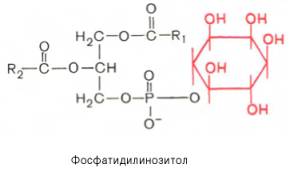 Фосфатидилинозитолы.Эти липиды относятся к группе производных фосфатидной кислоты, но не содержат азота. Радикалом (R3) в этом подклассе глицерофосфолипидов является шестиуглеродный циклический спирт инозитол: