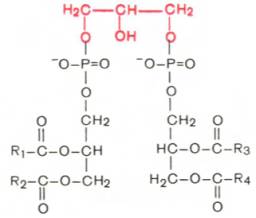 Кардиолипин.Своеобразным представителем глицерофосфолипидов является кардиолипин, впервые выделенный из сердечной мышцы. По своей химической структуре кардиолипин можно рассматривать как соединение, в котором 2 молекулы фосфатидной кислоты связаны с помощью одной молекулы глицерина. В отличие от остальных глицерофосфолипидов кар-диолипин является как бы «двойным» глицерофосфолипидом. Кардиолипин локализован во внутренней мембране митохондрий. Функция его пока неясна, хотя известно, что в отличие от других фосфолипидов кардиолипин обладает иммунными свойствами.