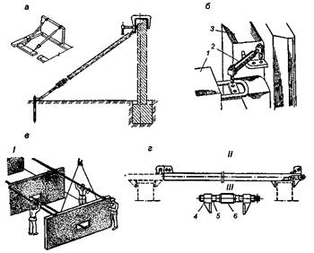 В качестве индивидуальных приспособлений для временного закрепления панелей служат телескопические подкосы, парные и откидные струбцины, раздвижные скобы (рис. 25.4, а, б). В нижней части подкосы крепятся за монтажные петли фундаментных блоков или к специальным якорям, предварительно забитым в грунт.