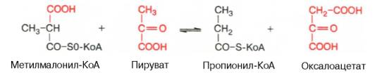 Примером второго типа реакций является метилмалонил-оксалоацетат-транскарбоксилазная реакция, катализирующая обратимое превращение пировиноградной и щавелевоуксусной кислот: