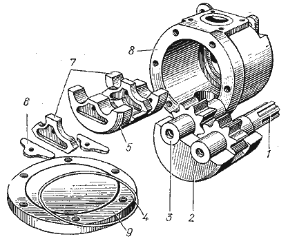 Шестеренный насос в разобранном состоянии представлен на рис.3.2. Шестеренный насос состоит из корпуса 8, выполненного из алюминиевого сплава, внутри которого установлены подшипниковый блок 2 с ведущей 1 и ведомой 3 шестернями и уплотняющий блок 5, представляющий собой другую половину подшипника. Для радиального уплотнения шестерен в центральной части уплотняющего блока имеются две сегментные поверхности, охватывающие с установленным зазором зубья шестерен. Для торцевого уплотнения шестерен служат две поджимные пластины 7, устанавливаемые в специальные пазы уплотняющего блока с обеих сторон шестерен. В поджимных пластинах и в левой части уплотняющего блока есть фигурные углубления под резиновые прокладки 6. Давлением жидкости из полости нагнетания пластины 7 прижимаются к торцам шестерен, благодаря чему автоматически компенсируется зазор, а утечки остаются практически одинаковыми при любом рабочем давлении насоса. Ведущая и ведомая шестерни выполнены заодно с цапфами, опирающимися на подшипники скольжения подшипникового и уплотняющего блоков. Одна из цапф ведущей шестерни имеет шлицы для соединения с валом приводящего двигателя. Насос закрывается крышкой 4 с уплотнительным резиновым кольцом 9. Приводной вал насоса уплотнен резиновой манжетой, закрепленной специальными кольцами в корпусе насоса.
