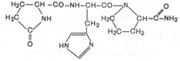 Тиролиберин представлен трипептидом, состоящим из пироглутаминовой (циклической) кислоты, гистидина и пролинамида, соединенных пептидными связями. В отличие от классических пептидов он не содержит свободных NH2- и СООН-групп у N- и С-концевых аминокислот.