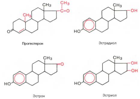 В настоящее время открыты 2 группы женских половых гормонов, различающихся своей химической структурой и биологической функцией: эстрогены (главный представитель – эстрадиол) и прогестины (главный представитель – прогестерон). Приводим химическое строение основных женских половых гормонов: