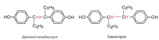 В медицинской практике широкое применение получили природные гормоны и синтетические препараты, обладающие эстрогенной активностью, которые в отличие от первых не разрушаются в пищеварительном тракте. К синтетическим эстрогенам относятся диэтилстильбэстрол и синэстрол, являющиеся производными углеводорода стильбена.