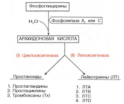 В последнее время были подтверждены представления С. Бергстрёма и сотр., что предшественником всех простагландинов являются полиненасыщенные жирные кислоты, в частности арахидоновая кислота (и ряд ее производных, дигомо-γ-линоленовая и пентаноевая кислоты, в свою очередь образующиеся в организме из линолевой и линоленовой кислот. Арахидоновая кислота после освобождения из фосфоглицеринов (фосфолипидов) биомембран под действием специфических фосфолипаз А (или С) в зависимости от ферментативного пути превращения дает начало простагландинам и лейкотриенам по схеме: