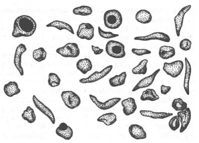 Классическим примером наследственной гемоглобинопатии является серповидно-клеточная анемия, широко распространенная в странах Южной Америки, Африки и Юго-Восточной Азии. При этой патологии эритроциты в условиях низкого парциального давления кислорода принимают форму серпа (рис. 32). Гемоглобин S, как показали Л. Полинг и др., отличается рядом свойств от нормального гемоглобина: в частности, после отдачи кислорода в тканях он превращается в плохо растворимую дезоксиформу и начинает выпадать в осадок в виде веретенообразных кристаллоидов, названных тактоидами. Болезнь протекает остро, и дети, гомозиготные по мутантному гену, часто умирают в раннем возрасте.