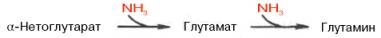 Часть аммиака легко связывается с α-кетоглутаровой кислотой благодаря обратимости глутаматдегидрогеназной реакции. Если учесть связывание одной молекулы аммиака при синтезе глутамина, то нетрудно видеть, что в организме имеется хорошо функционирующая система, связывающая две молекулы аммиака: