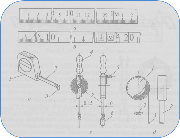 Рис. 24 Стальные рулетки : а,б – виды делений; в – карманная автоматическая сматывающаяся; г – на вилке; д – в футляре