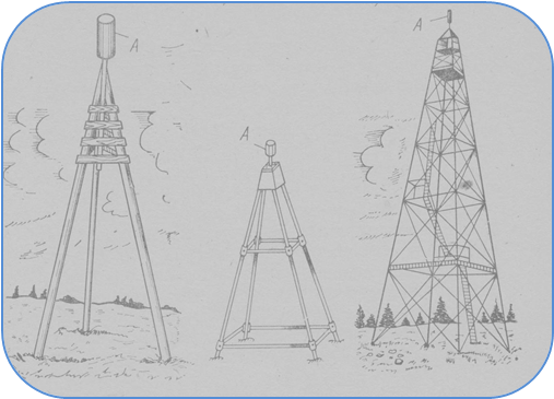 При больших расстояниях между пунктами опорных сетей для обеспечения видимости над точками устанавливают специальные знаки в виде пирамид или сигналов (рис.45).