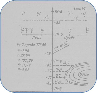 Чтобы выполнить геодезические работы по трассе в общепринятой системе координат и высот, трассу привязывают к пунктам геодезической опорной сети в начале и конце трассы. После разбивки пикетажа приступают к нивелированию, одновременно с нивелированием составляется пикетажный журнал (рис.55).