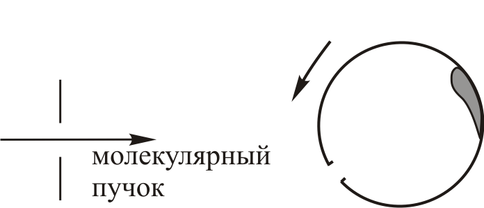 Молекулы с различными скоростями достигают противоположной стенки цилиндра с различным запаздыванием по отношению к моменту прохождения щели и поэтому попадают на разные участки внутренней стенки цилиндра. Точка попадания на стенке смещается против вращения на расстояние
