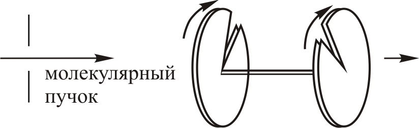 Если щели повёрнуты на угол относительно друг друга, то при угловой скорости диски повернутся на угол в течение промежутка времени Δt=φ/ω. Поэтому через обе щели, расстояние между которыми , пройдут молекулы со скоростью