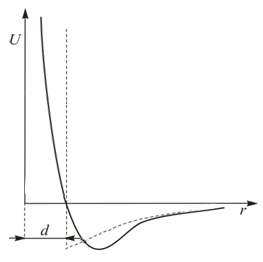 В теории Ван-дер-Ваальса используется упрощенная модель межмолекулярного взаимодействия в газе. На рис. 13.4 можно сравнить реальный потенциал типа Леннарда-Джонса (13.6) и потенциал Ван-дер-Ваальса, изображенный пунктирной линией.