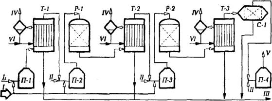 Рис. 3. Принципиальная технологическая схема установки получения серы из сероводорода по методу Клауса: I - сероводород; II - воздух; III - сера; IV - водяной пар; V - газы дожила; VI - конденсат