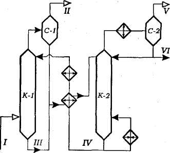 Рис 3.4 Принципиальная схема установки этаноламиновой очистки горючих газов: I -сырьевой газ; II - очищенный газ; III -насыщенный раствор амина; IV - регенерированный раствор; V - кислые газы; VI - водный конденсат; К-1 - абсорбер; К-2 -десорбер; С-1 - каплеотбойник; С-2 - сепаратор