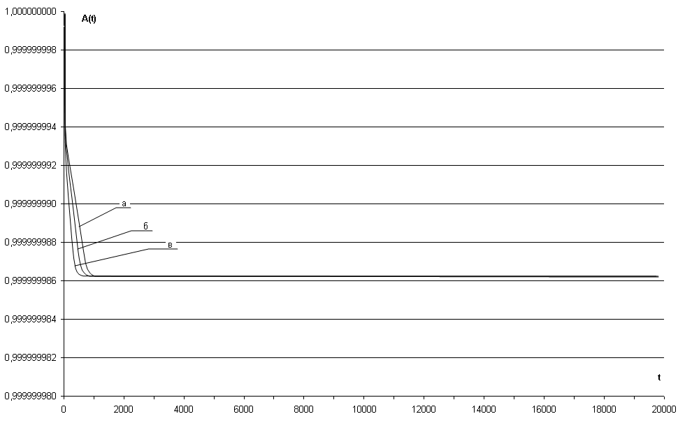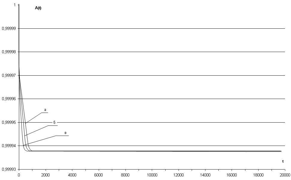 На указанных графиках прослеживается однообразный характер изменения коэффициента готовности АЗД(t) от времени эксплуатации системы, который имеет следующие характерные особенности: