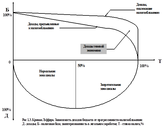 Рис 1.1. Кривая Лаффера — зависимость доходов бюджета от прогрессивности налогообложения (Д — доходы; Б — налоговая база; заинтересованность в легальном заработке; Т — ставка налога, %.)