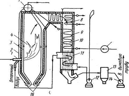 Продукты сгорания после воздухоподогревателя называют уходящими газами. Их температура 110—160°С. Утилизация теплоты уходящих газов очень затруднительна, поэтому дымососом 14 их направляют через дымовую трубу в атмосферу.
