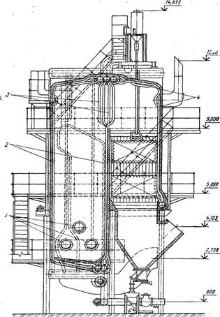 Башенные газомазутные котлы теплопроизводительностью 50, 100 и 180Гкал/ч имеют конвективные поверхности, размещенные над топочной камерой.