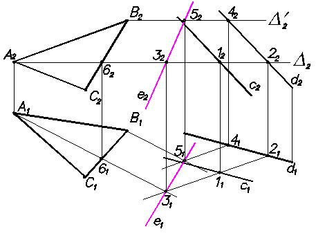 На приведенном Рис.47 мы видим, что прямые А6 и 12, находясь в одной плоскости D, пересекаются в точке 3, принадлежащей искомой прямой e.