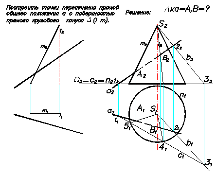 При решении задач по определению точек пересечении линейчатых поверхностей (конических, цилиндрических, пирамидальных и призматических) с прямыми общего положения в качестве плоскостей – посредников используют плоскости общего положения. Такая плоскость, к примеру, проведенная через вершину конической поверхности и заданную прямую общего положения, пересекает коническую поверхность по двум образующим. Точки пересечения полученных образующих с исходной прямой общего положения (рассматриваемые прямые принадлежат одной плоскости) и являются точками пересечения заданных в условии задачи прямой общего положения и конической поверхности.