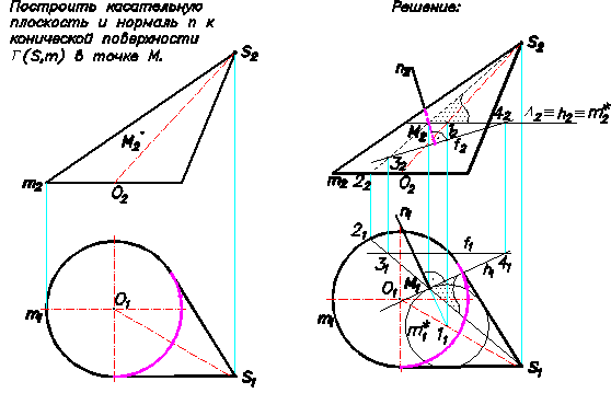 Пример 1. Построить плоскость S, касательную к конической поверхности Г (S,m) в точке М, принадлежащей данной поверхности. Построить нормаль n к конической поверхности Г в этой точке (Рис.61).