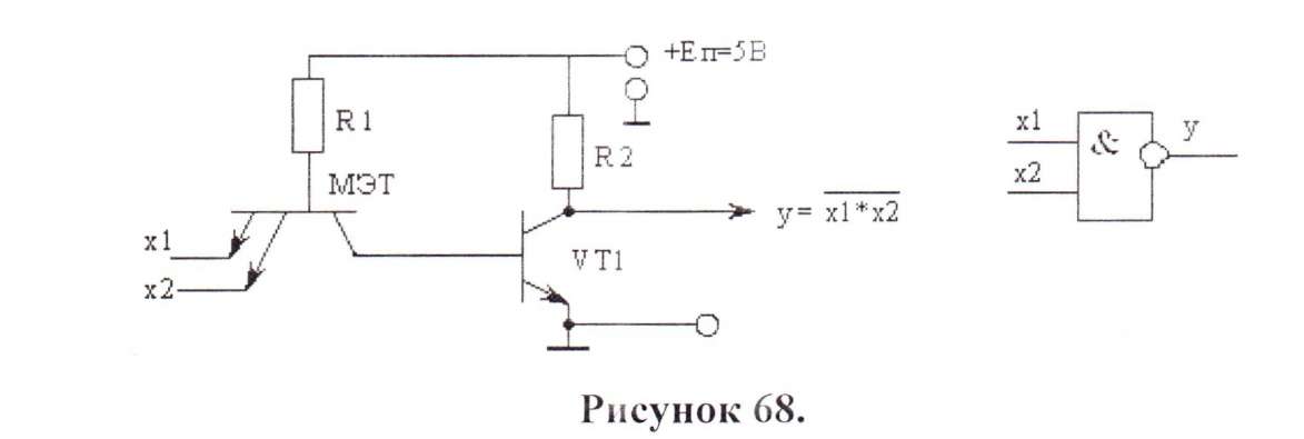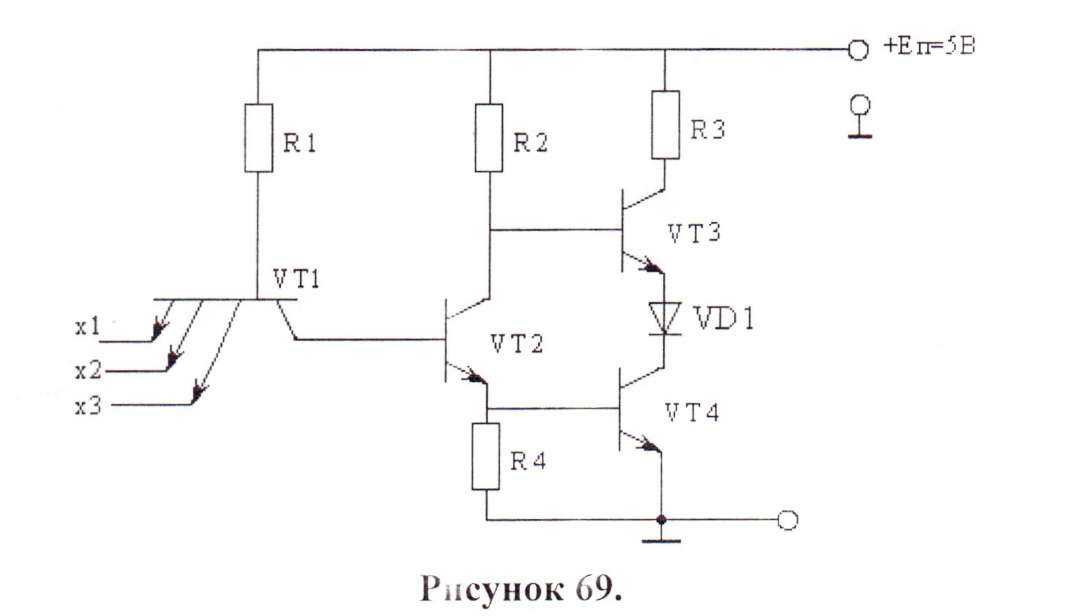 В данной схеме диоды VD1 - VD3 образуют схему коньюнктора (умножение), диоды VD4÷VD5 схему передачи с коньюнктора на инвертор VT1. Диоды VD4, VD5 обеспечивают надежное запирание транзистора VT1, если на одном из входов х будет низкое напряжение U0.