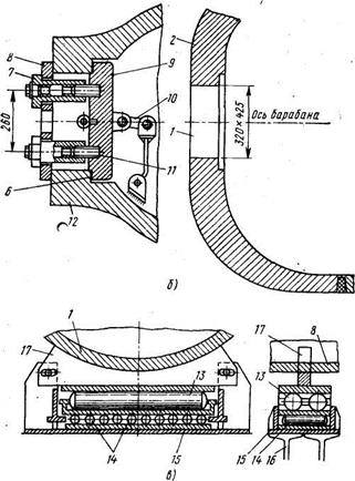 При эксплуатации барабан нагревается и удлиняется. Чтобы опоры барабана не препятствовали перемещению его концов, они сделаны на роликах (рис. 1, в); конец барабана вместе с верхней подушкой перемещается по роликам 14, которые перекатываются по нижней плите 15. укрепленной на опорной балке каркаса. Трубы экранов и пароперегревателя приваривают к штуцерам барабана.