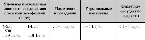 Использование ручных сотовых телефонов приводит к возникновению как физиологических, так и поведенческих реакций. В таблице 2.1 приведены данные, позволяющие сравнить пороги некоторых биологических эффектов со средними уровнями мощности сотовых телефонов.