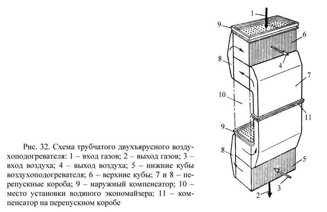 Трубчатый воздухоподогреватель (рис. 32) состоит из отдельных элементов (кубов), в которых вертикальные прямые стальные трубы 51х1,5 или 40х1,5 мм, расположенные в шахматном порядке, приварены своими концами к горизонтальным трубным доскам. Внутри труб движутся дымовые газы, а между трубами в горизонтальном направлении проходит воздух. Обычно по ширине котлоагрегата устанавливают несколько колонок воздухоподогревателя, а по вертикали – по нескольку кубов. Из одного куба в другой воздух переходит по перепускным коробам. Для компенсации теплового расширения воздухоподогревателя устанавливают наружный линзовый компенсатор, привариваемый внизу к верхнему кубу, а вверху – к обшивочной раме. В воздухоподогревателях высотой более 3 м устанавливают дополнительно боковые компенсаторы между верхними трубными досками и наружными стенами конвективной шахты.