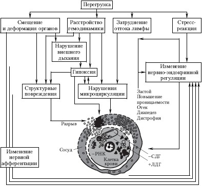 Вопрос об удельной значимости расстройств гемодинамики и необычных афферентных влияний в развитии нарушений деятельности организма при перегрузках различного направления продолжает оставаться еще недостаточно ясным и требует дальнейшего изучения. Полагают, что роль каждого из указанных механизмов может существенно изменяться в зависимости от характера воздействия, в частности длительности, величины, направления и повторности перегрузок.
