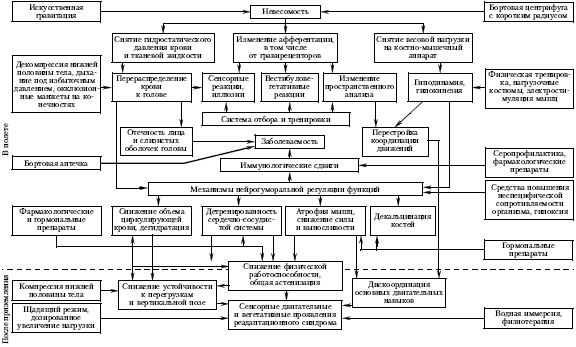 Наиболее перспективные направления профилактических воздействий определяются механизмами формирования изменений, происходящих в невесомости. На достаточно упрощенной схеме патогенеза нарушений, обусловленных влиянием невесомости (рис. 3.4), показаны некоторые из возможных направлений и средств профилактики (звенья патогенеза и связь между ними обозначены тонкими линиями и стрелками, профилактические средства и направления их воздействия – жирными линиями и стрелками).