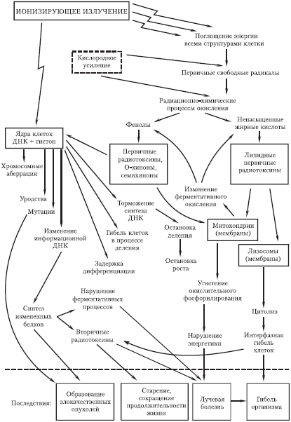 Рис. 3.6.Механизмы развития радиационного поражения (по: А. М. Кузин, 1970)