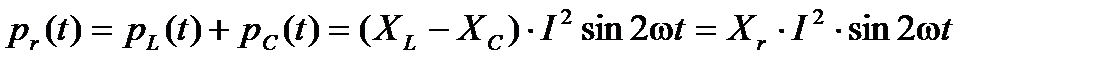 Каждое из этих слагаемых изменяются с удвоенной (относительно тока) частотой, но имеют противоположные фазы (рис.5.3). Так как постоянная составляющая в (5.17) и (5.18) отсутствует, то среднее значение каждого из них равно нулю. Однако сумма РL(t) и РC(t) отлична от нуля и определяет мгновенную мощность реактивных элементов (участков) цепи. Определим ее: