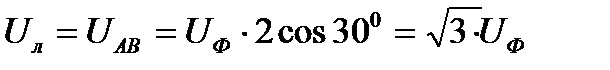 раз больше фазового напряжения генератора. Это следует из того, что UЛ есть основание равнобедренного треугольника с острыми углами по 300 (рис. 7.10):