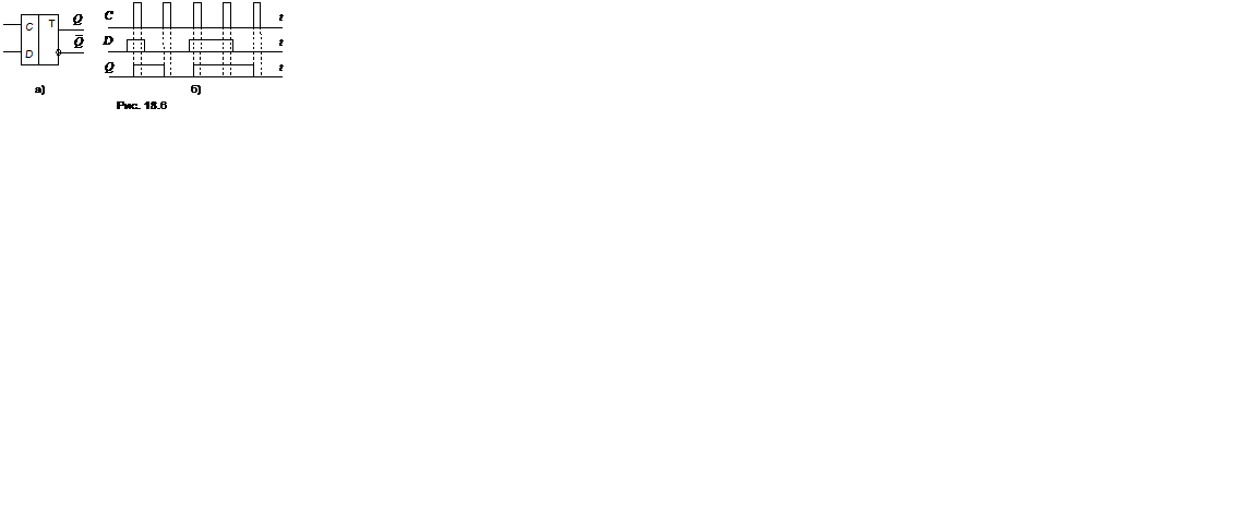 . Поэтому D-триггер является элементом памяти и находит широкое применение, в том числе в регистрах. Условное обозначение D-триггера и временные диаграммы, поясняющие его работу, приведены на рис. 18.6.