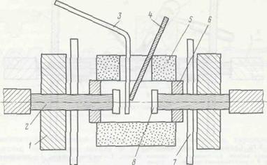 / — охладитель, 2 — жила кабеля; J — мешалка: 4 — присадочный пруток; 5 — термитный патрон 6 - уплотнение асбестовым шнуром;7 -экран. 8 — алюминиевый колпачок