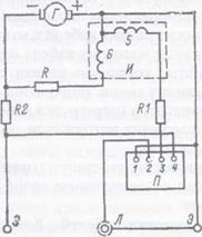 Мегомметр состоит из генератолра постоянного тока Г, вращаемого от руки, измеряемого магнитоэлектрического прибора И, логометрической системы и добавочных сопротивлений. Нормальная частота вращения ручки прибора 120 об/мин. Переключатель П служит для переключения пределов измерения мегомметра. Прибор имеет три зажима с надписями: линия Л, земля З, экран Э. Зажимы Л З присоединяют к объекту и земле в случае измерения сопротивления изоляции относительно земли или оба зажима присоединяются к электрическим цепям, между которыми измеряют сопротивление изоляции. Если результат измерения изоляции объекта искажен поверхностными токами по изоляции, на изоляцию объекта накладывают экранные электроды, которые присоединяют к зажимам мегомметра Э. На верхнем пределе измерений замкнуты контакты 2 и 3 переключателя пределов П. При этом образуется последовательная цепь тока: плюс генератора, рабочая рамка логометра 5, резистор R1, контакты пере-ключателя 3 и 2, зажим Л, измеряемое сопротивление, зажим 3, резистор R2 и минус генератора. Измеряемое сопротивление включается последовательно в цепь между зажимами Л и 3. При замкнутых накоротко зажимах Л и 3 и нормальной частоте вращения генератора стрелка логометра устанавливается па начальной отметке шкалы — нуль. При разомкнутых зажимах Л и 3 и тех же условиях стрелка логометра устанавливается на конечной отметке шкалы — бесконечность.
