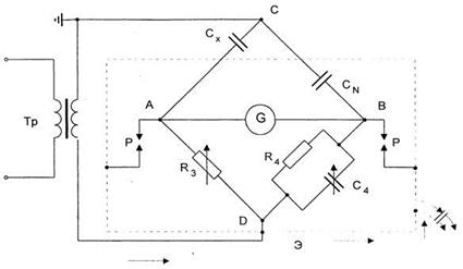 Рис. 6.1 - Перевернутая (обратная) схема включения моста переменного тока. Тр - испытательный трансформатор; СN - образцовый конденсатор; Сх - испытываемый объект; G - гальванометр; R3- переменный резистор; R4 - постоянный резистор; С4 - магазин емкостей.