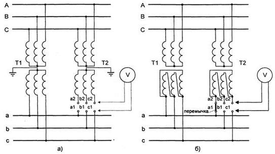 Фазировка трансформаторов производится перед их включением на параллельную работу между собой или с сетью. При отсутствии тождественности фаз напряжений включаемых трансформаторов возможно появление значительных уравнительных токов между ними, которые приводят к ограничению мощности или значительной перегрузке трансформаторов, а при несовпадении чередования фаз - к короткому замыканию. Фазировка заключается в измерении напряжения между разноименными фазами включаемого трансформатора и сети (или другого, работающего трансформатора) и определении отсутствия напряжения между одноименными фазами. При проведении фазировки должна быть обеспечена электрическая связь между фазируемыми цепями для образования электрически замкнутого контура, необходимого для измерений. В качестве такой связи могут выступать заземленные нейтрали фазируемых трансформаторов, общий нулевой провод или соединение любой пары предполагаемых одноименных фаз с помощью разъединителя или временной перемычки. Фазировка производится с помощью вольтметра до 380 В или вольтметра и трансформатора напряжения. При напряжении 2-10 кВ фазировка может производиться с помощью специальных указателей напряжения.