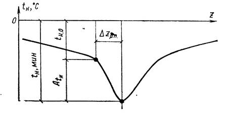 Основным показателем холодного периода года является изменение температуры наружного воздуха tн. Для ряда климатических районов с учётом различных значений коэффициента обеспеченности Kоб. n построены расчётные кривые изменения tн в период резкого похолодания. Для различных районов они имели характерную и близкую по очертаниям форму (смотри рисунок). Сначала температура медленно понижалась до начала периода резкого похолодания, а затем имела место резкое снижение температуры с переходом через минимум и медленное повышение температуры после конца периода резкого похолодания