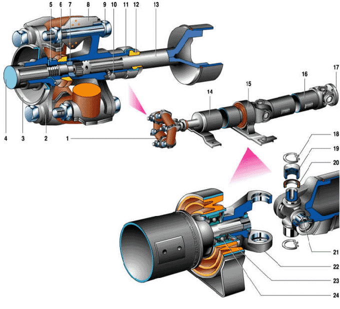 1 – эластичная муфта; 2 – фланец вторичного вала коробки передач; 3 – грязеотражатель; 4 – вторичный вал коробки передач; 5 – гайка; 6 – уплотнитель центрирующего кольца; 7 – центрирующее кольцо; 8 – вкладыши эластичной муфты; 9 – болт;10 – пробка;11 – фланец переднего карданного вала;12 – манжета; 13 – шлицевой конец переднего карданного вала; 14 – передний карданный вал; 15 – промежуточная опора;16 – задний карданный вал; 17 – фланцевая вилка; 18 – стопорное кольцо;19 – подшипник карданного шарнира; 20 – манжета;21 – крестовина; 22 – вилка; 23 – упругая подушка 24 – подшипник промежуточной опоры.